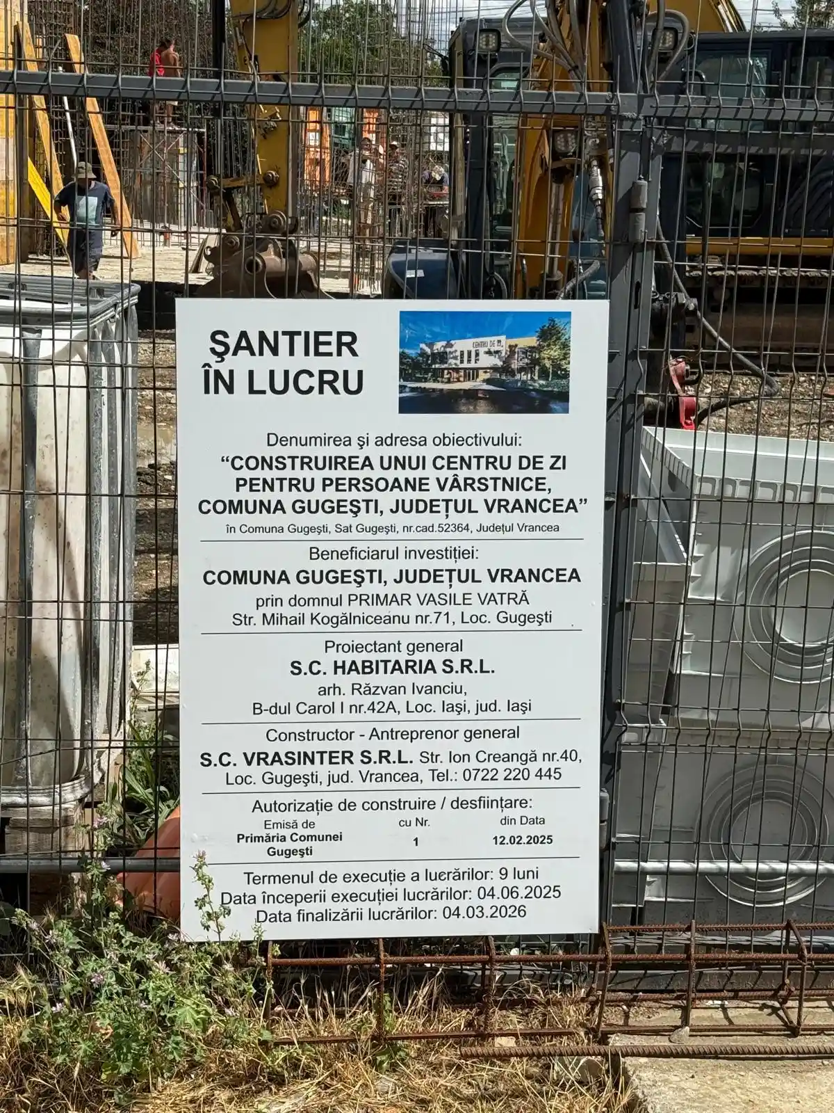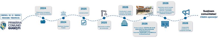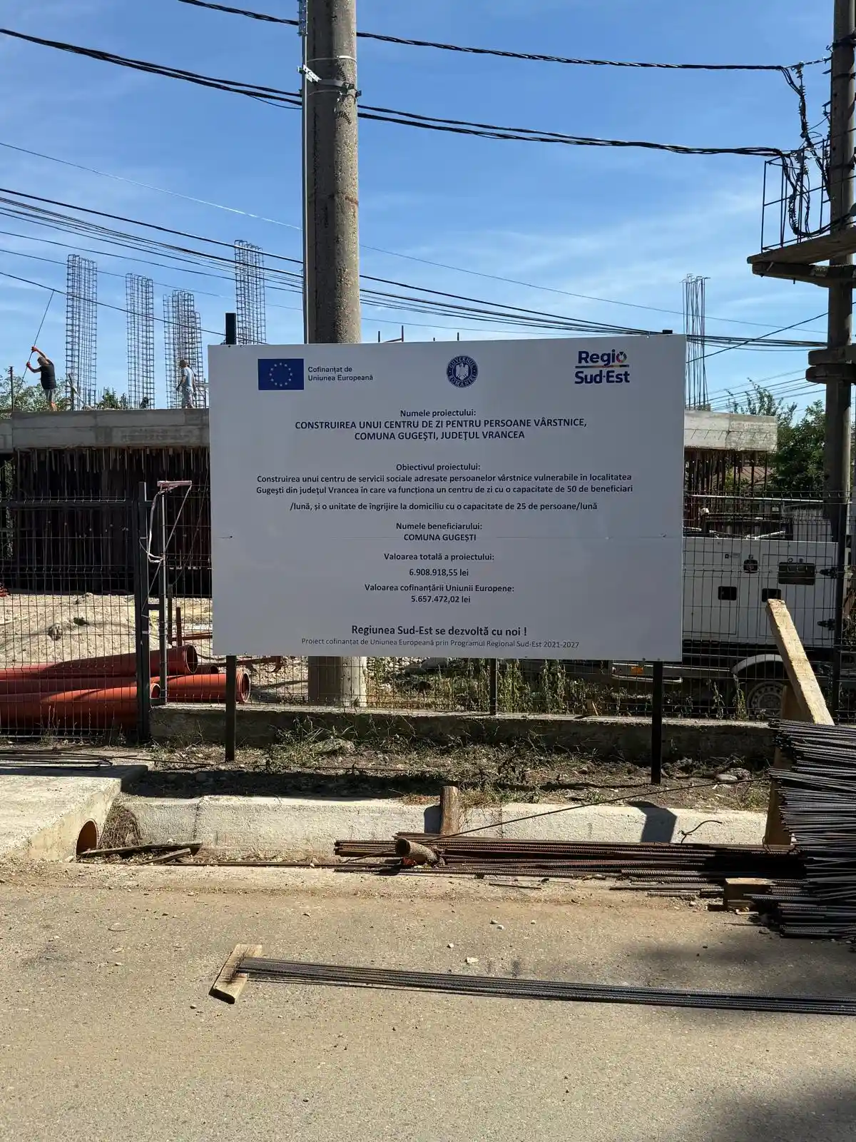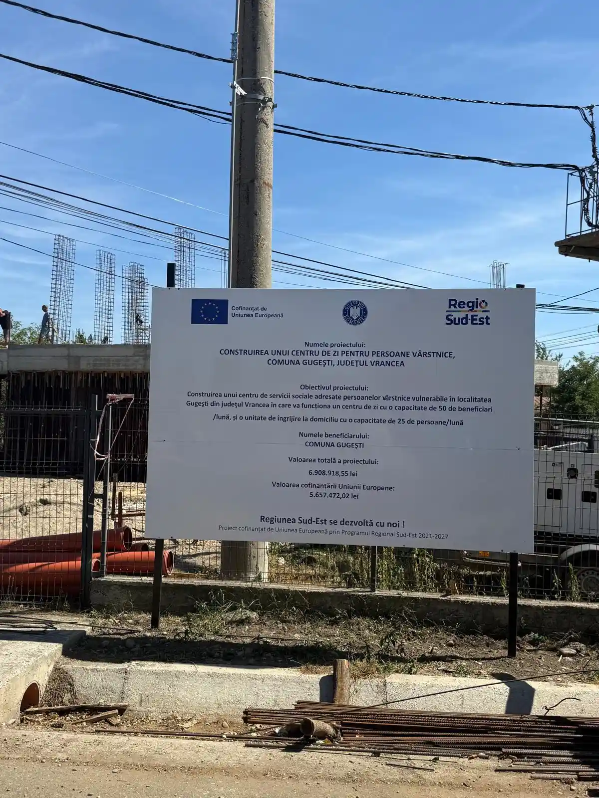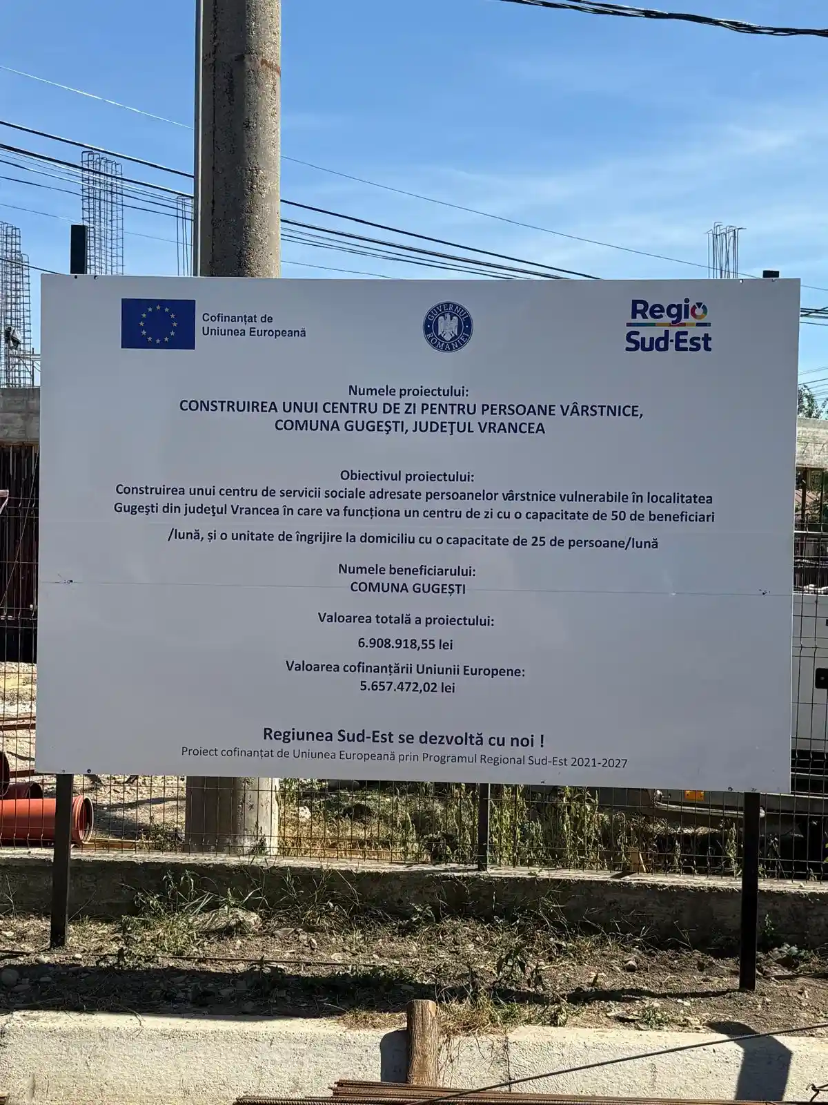 COMUNA GUGEȘTI, în calitate de Beneficiar, implementează proiectul „ CONSTRUIREA UNUI CENTRU DE ZI PENTRU PERSOANE VÂRSTNICE, COMUNA GUGEȘTI, JUDEȚUL VRANCEA”, cod MySMIS 321648, finanțat prin Programul Regional Sud-Est 2021-2027, Prioritatea de investiţie P6. “Servicii de suport pentru persoane vârstnice”, Acțiunea Acțiunea 6.2 “Servicii de sprijin vârstnici vulnerabili afectați de probleme locative”.